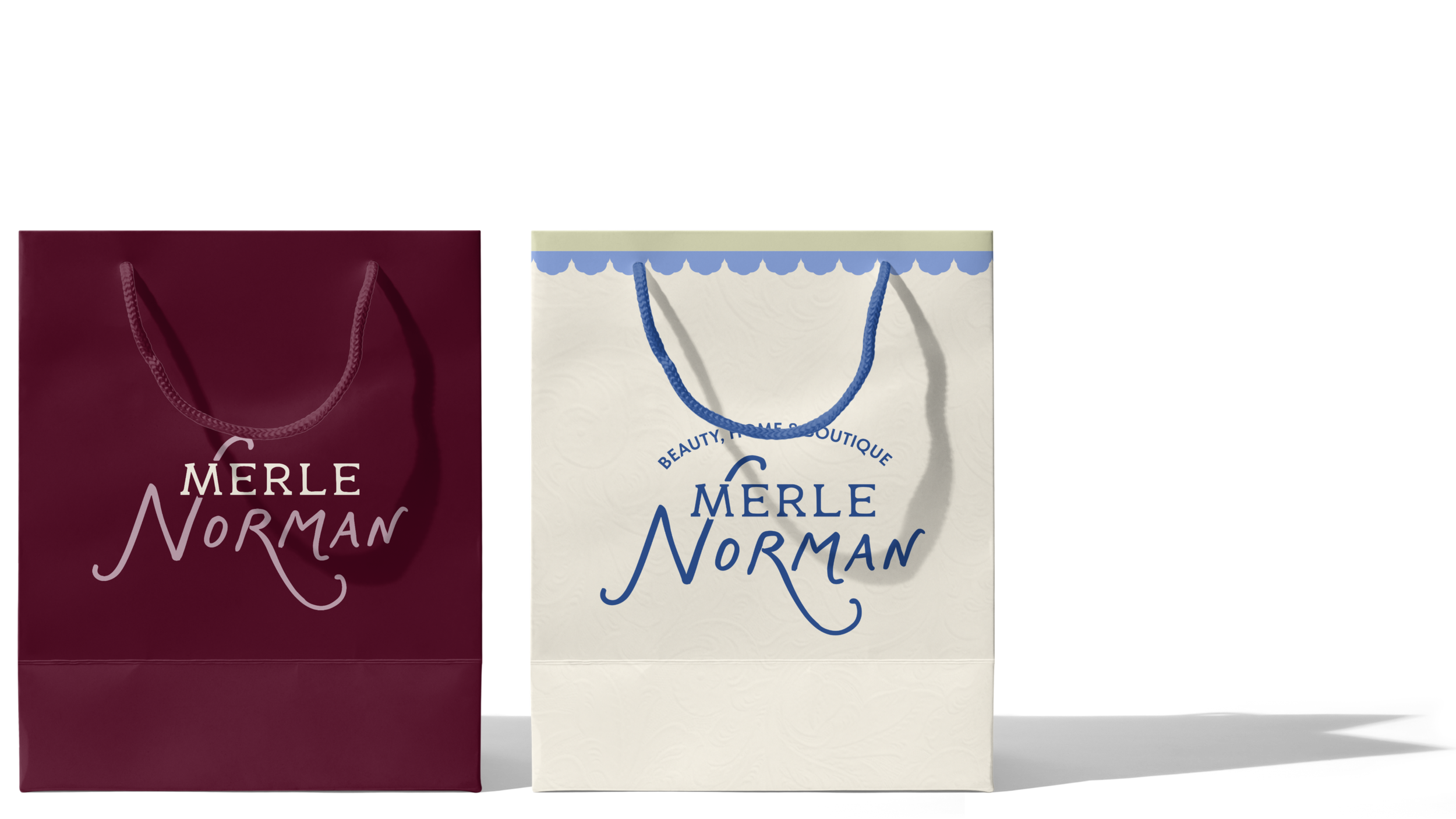 Two shopping gift bags with the logo 'Merle Norman' on them. The left bag is maroon with a matching maroon rope handle. The right bag is cream-colored with blue text and a decorative blue border at the top, with a blue rope handle.