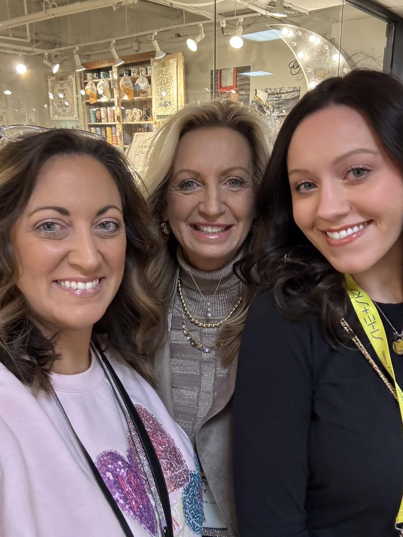 Three women smiling for a selfie indoors, with a background of a store or café decorated with books and signs.