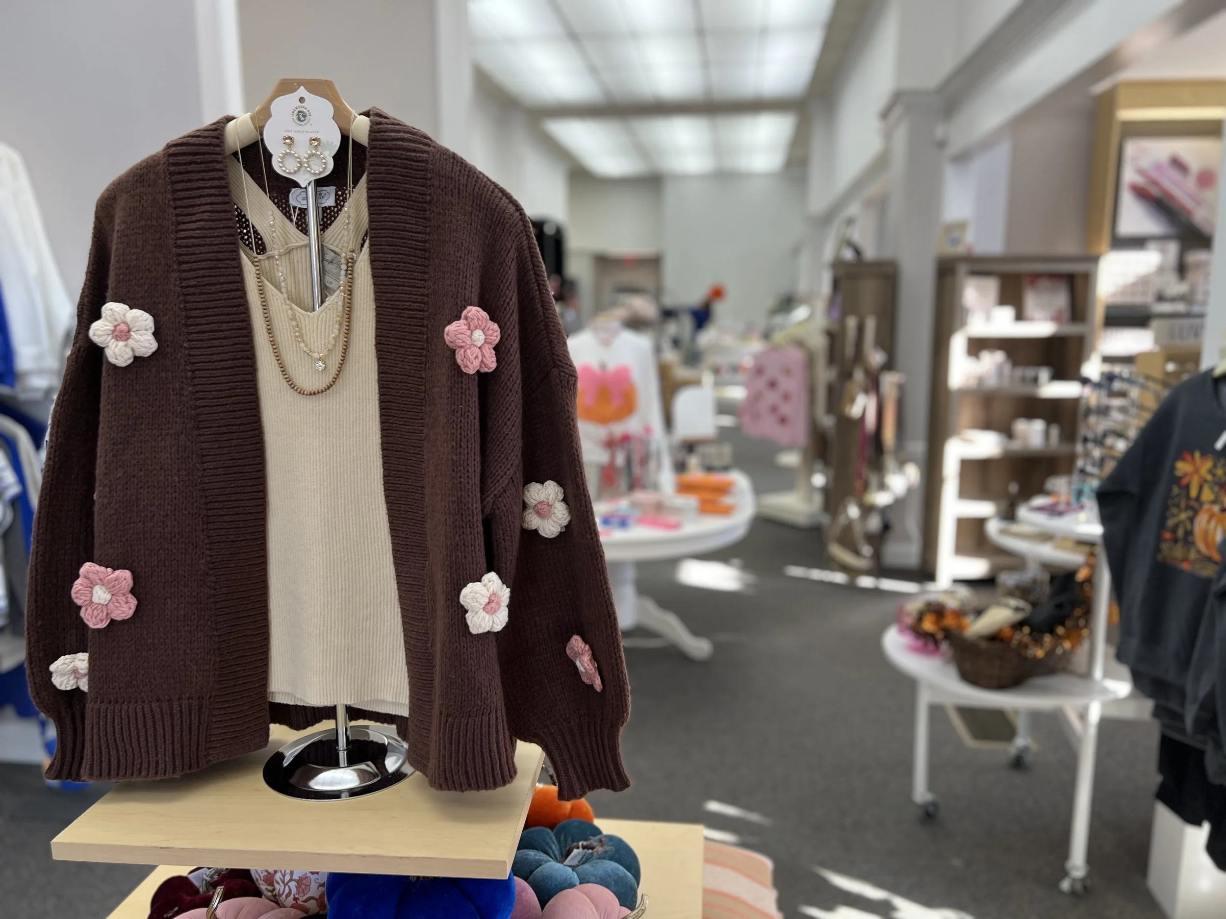 Brown cardigan sweater with pink and white flower appliqués displayed on a mannequin, accessorized with layered necklaces and earrings, in a retail store.