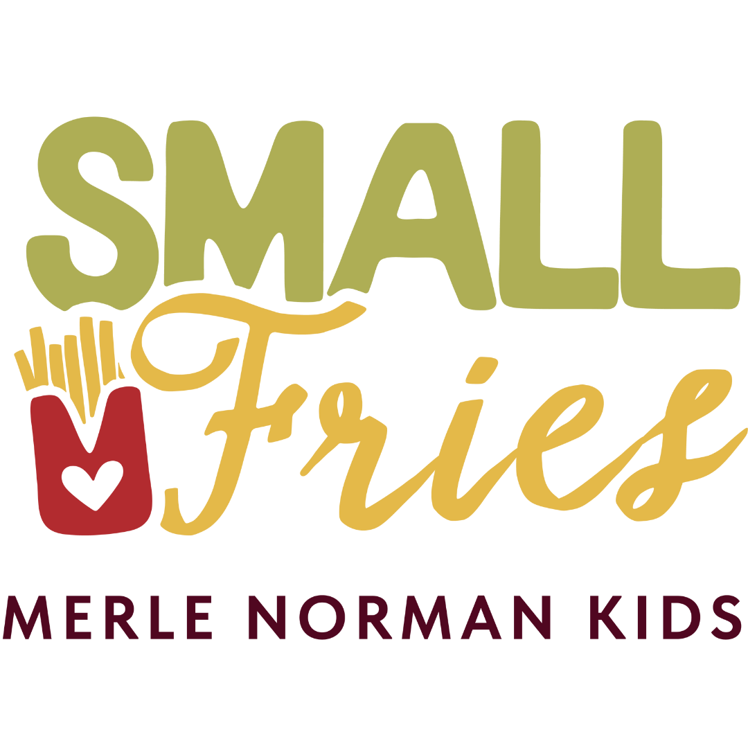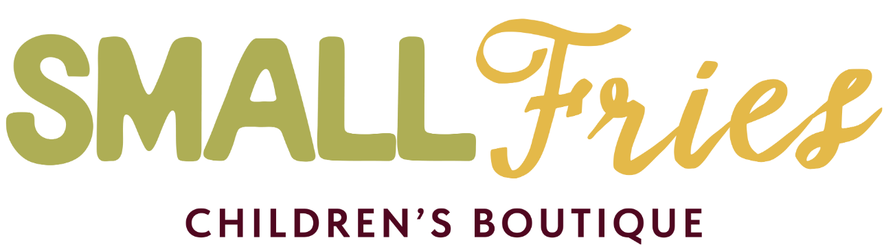 Logo for Small Fries Children's Boutique with the words 'Small Fries' in large green and gold cursive font and 'Children's Boutique' in smaller maroon capital letters.