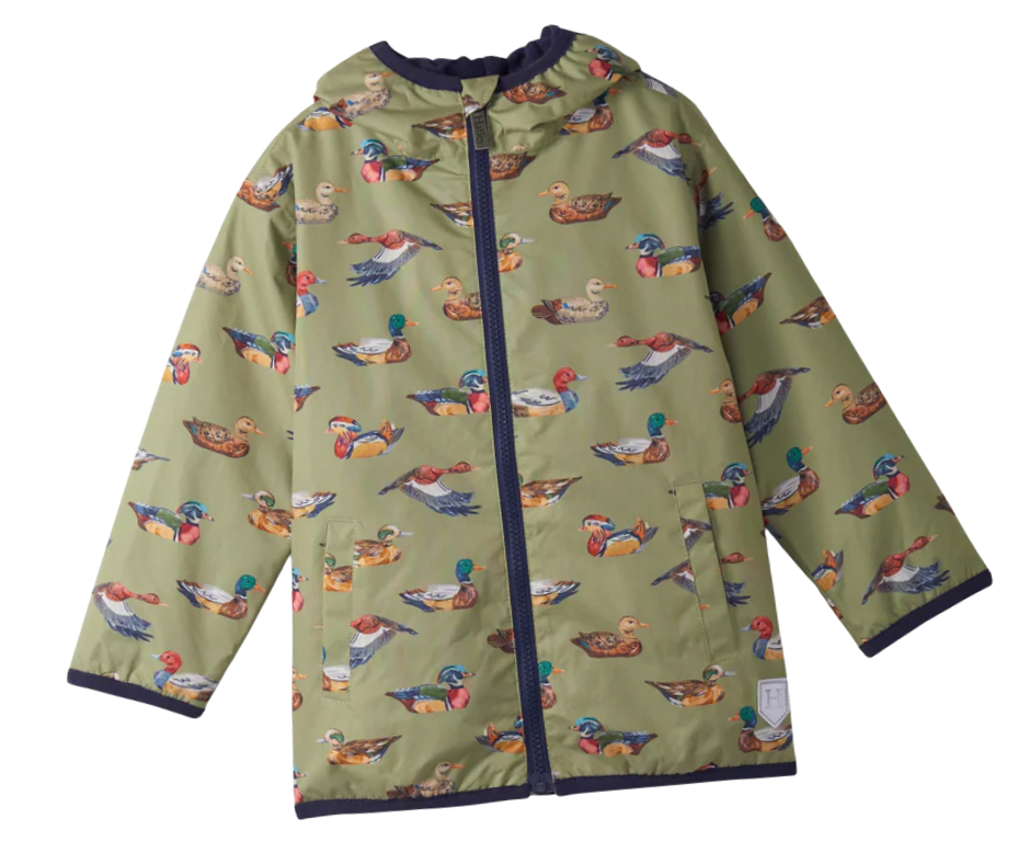Green jacket with a duck and bird pattern, zipper front, and black trim at the collar and cuffs.