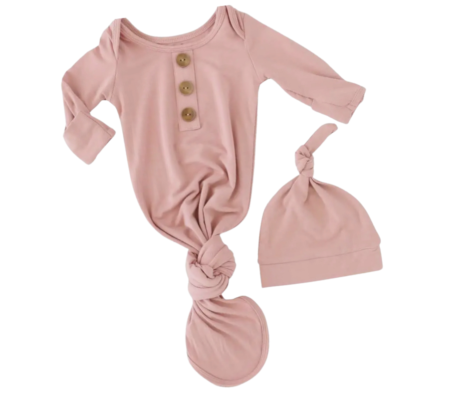 Pink baby hat and matching knotted shirt with three buttons.