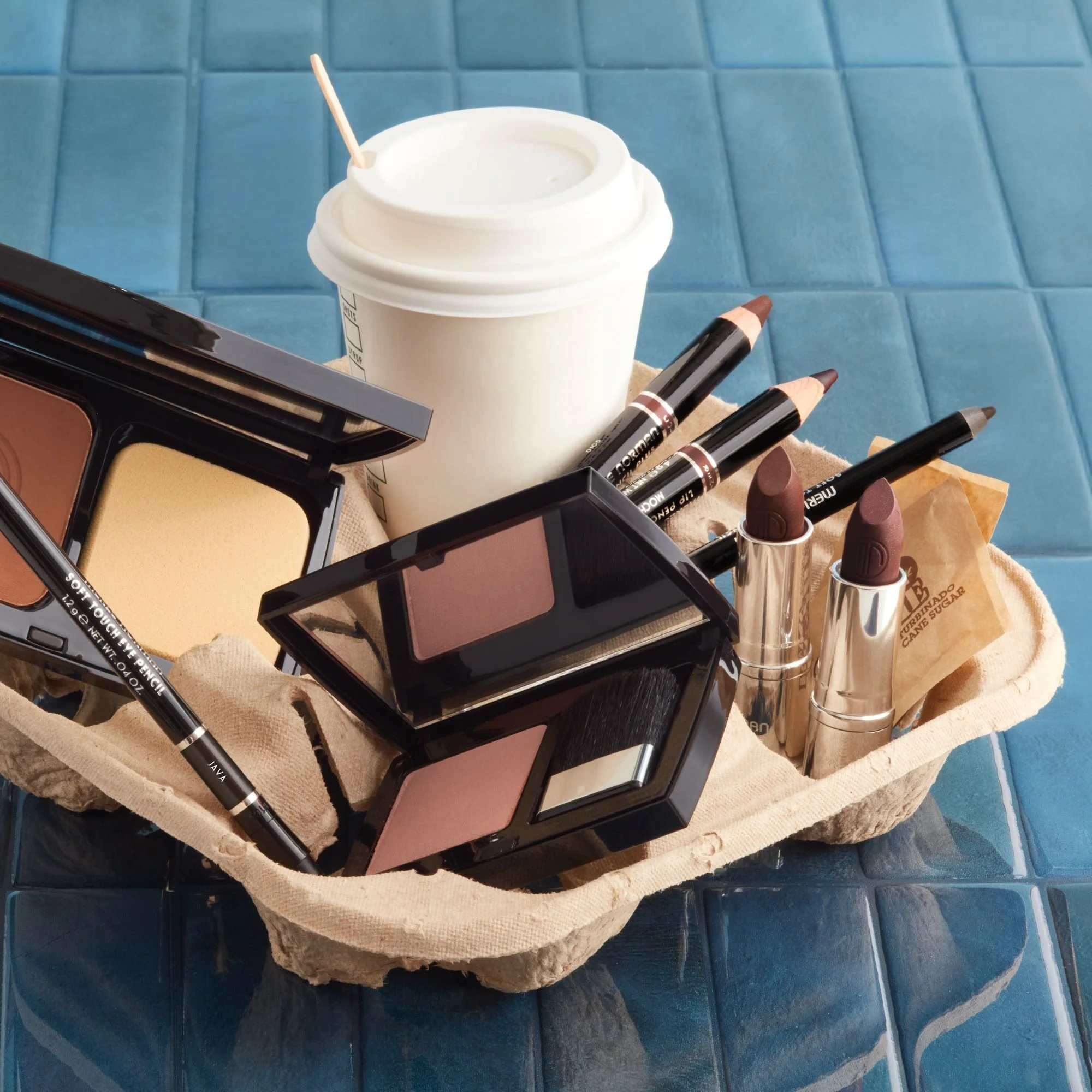 Collection of makeup products including lipsticks, compacts, and brushes, along with a takeaway coffee cup in a basket on a blue tiled surface.