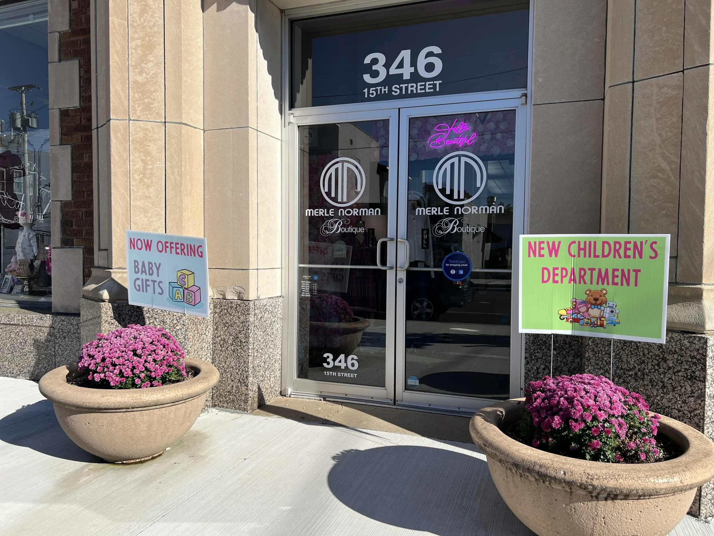 Decorative storefront with signs promoting baby gifts and a new children's department, featuring large pink potted flowers outside.