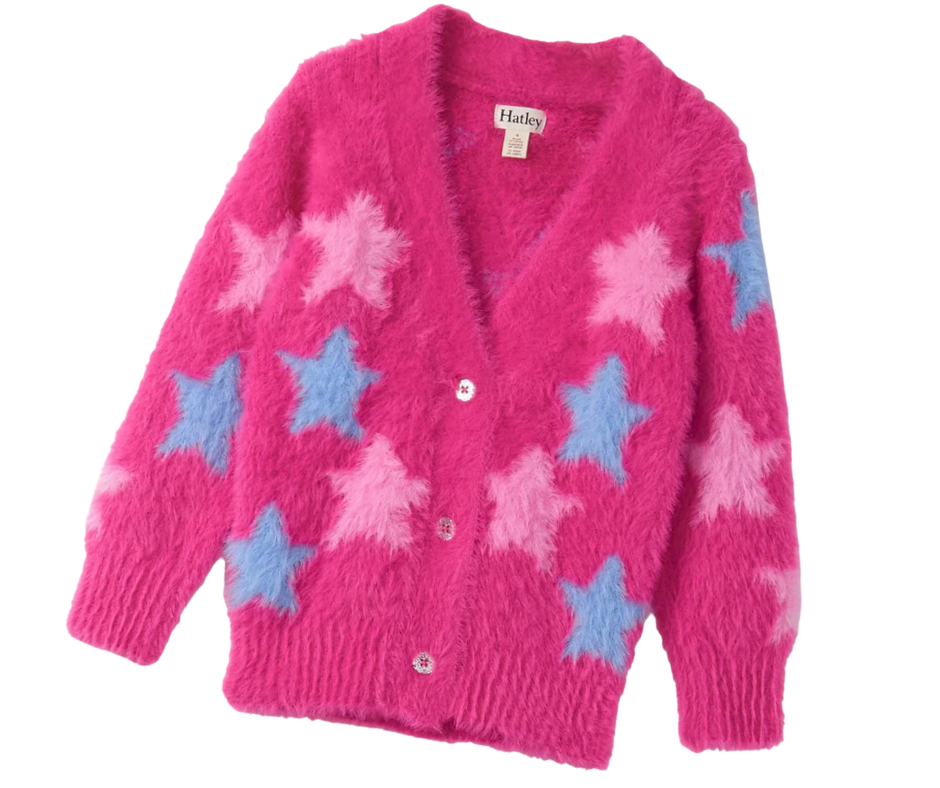 Pink cardigan sweater with blue and pink star patterns, button-up front, and fuzzy texture.