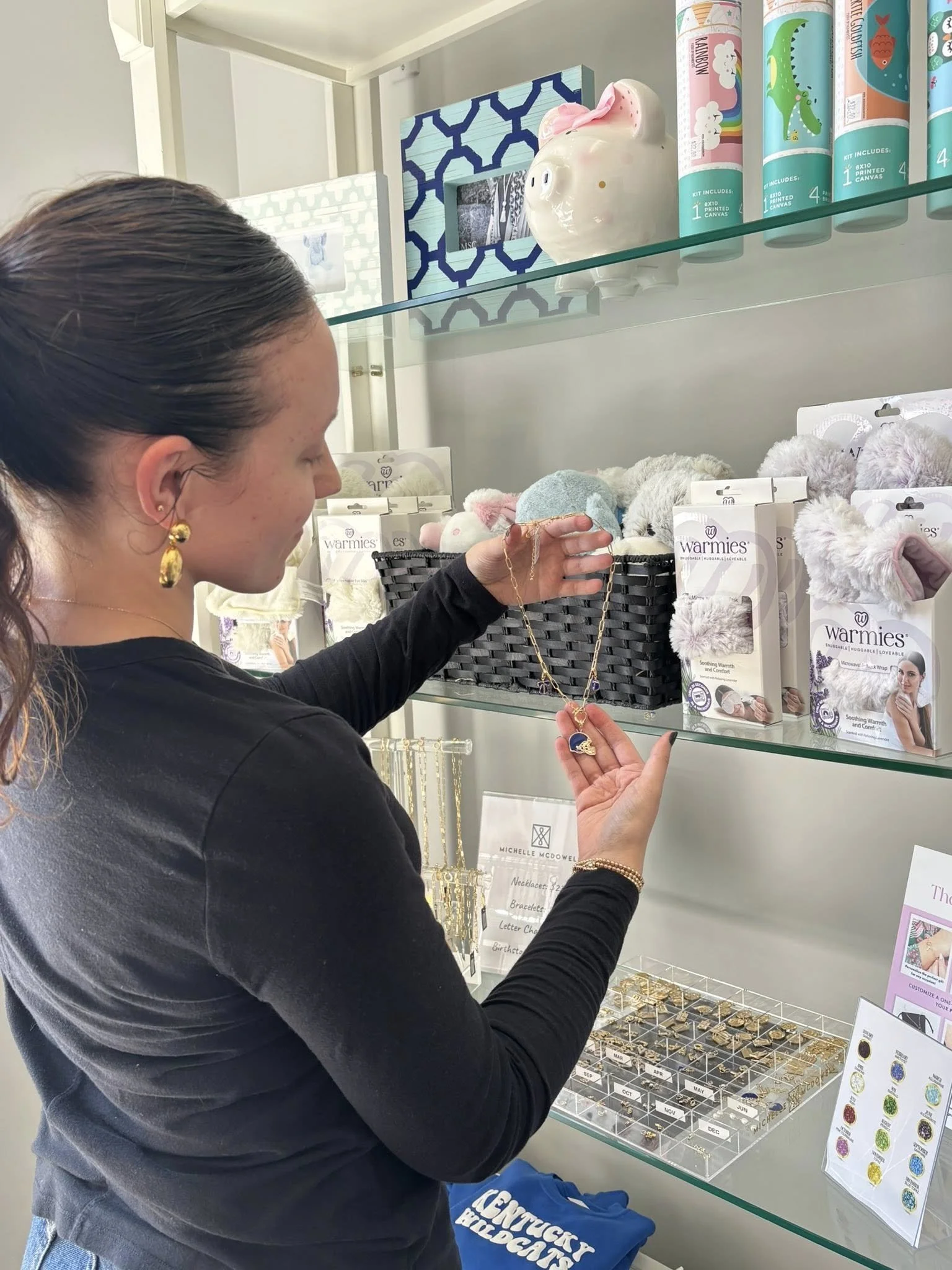 A woman browsing jewelry and plush toys in a gift shop, looking at a necklace with a whale pendant.