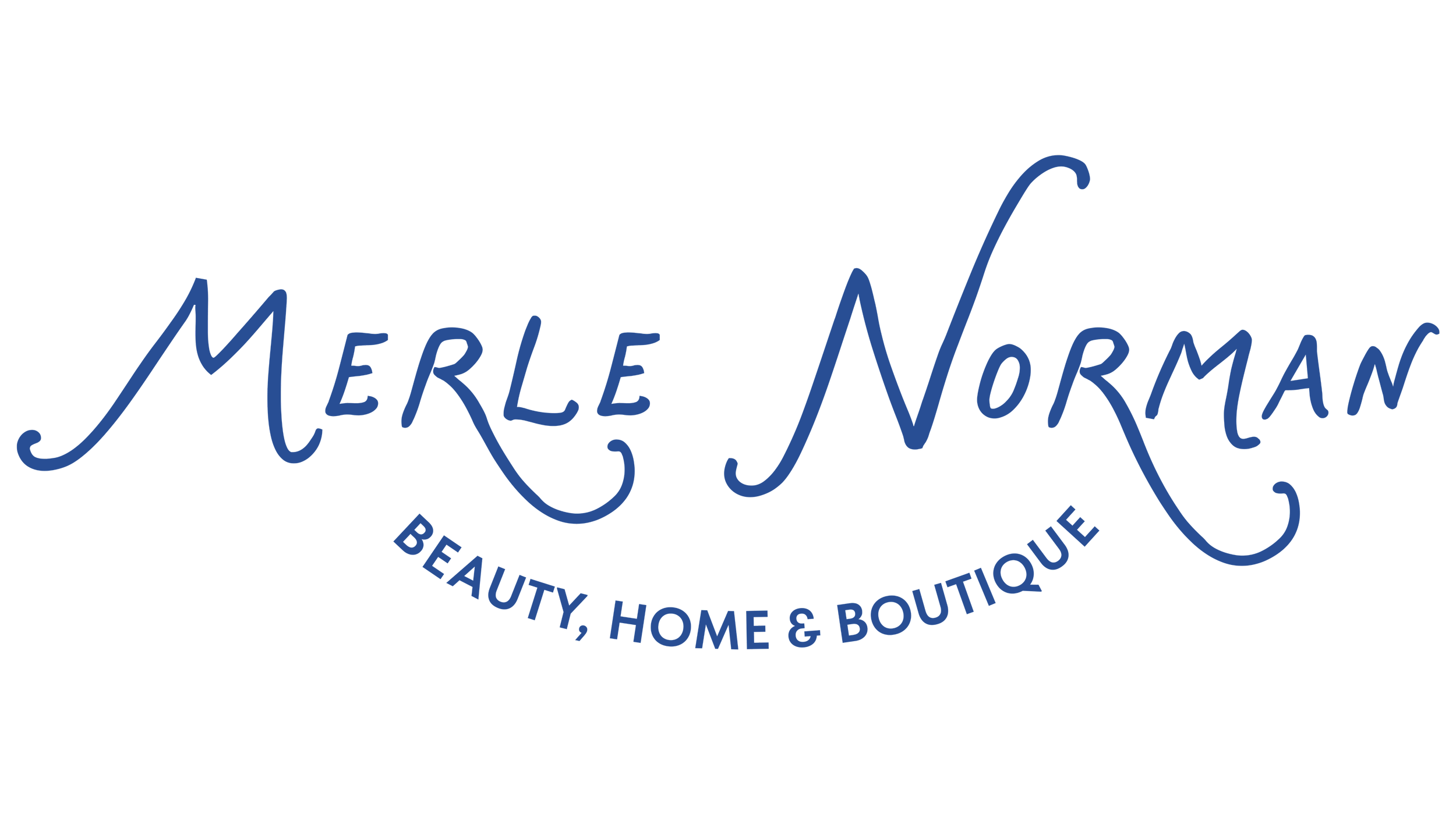 Merle Norman logo with the text 'Beauty, Home & Boutique' in blue cursive font on a black background.